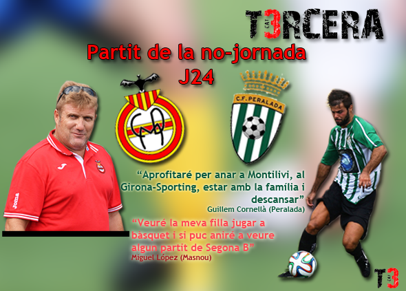 3. Sí, i tant. I més jo, perquè diumenge passat no vaig poder jugar [el Peralada-Castelldefels] perquè estava enfebrat, i la veritat és que quinze dies sense jugar es fan molt llargs. T'entrenes per jugar, i de cop i volta no fer-ho... a més nosaltres també tenim l'inconvenient que molts treballem, i desplaçar-nos entre setmana podria ser un problema. Encara hem tingut sort i no és gaire lluny. Anar un dimecres al Masnou a molta gent li pot causar molèsties a la feina. Sí que hauria preferit jugar.